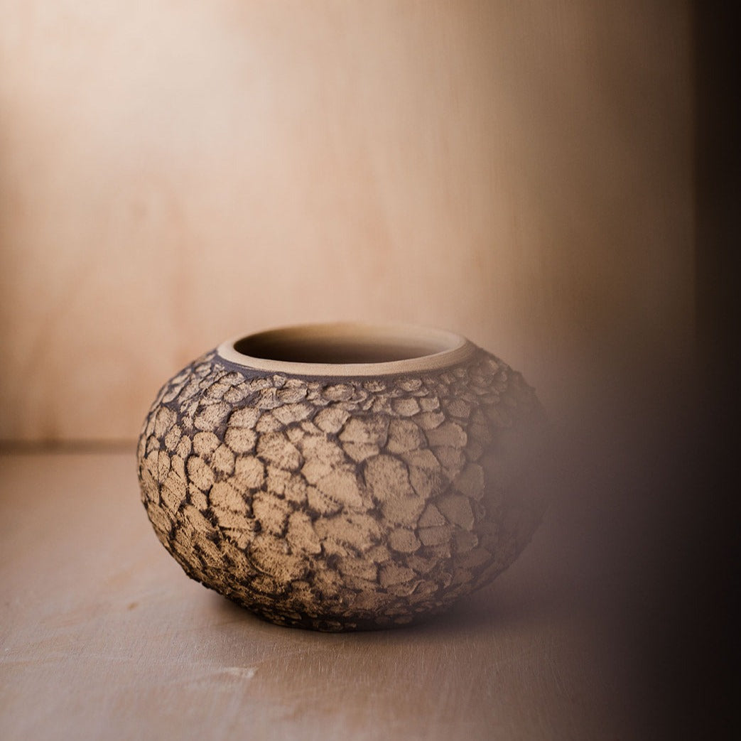 Les boles amb textura també són una col·lecció diversa. Estan fetes al torn, amb tècniques diferents, però totes parteixen de l'expansió. És a dir, començo amb un cilindre, aplico una textura, i després obro la peça només tocant l'interior. La textura s'amolla a la forma i genera efectes. La gamma de colors sempre és terròs, utilitzo directament l'acabat dels fangs en cru, sense esmalt. Poden ser de decoració, com per posar plantes, ja que al no estar esmaltades són poroses. Aquesta peça en concret és de gres d'alta temperatura i és de format petit. Els colors són terròs clar de fons, i negre al damunt. Mides: 15cmØ (part ample) x 10 cm