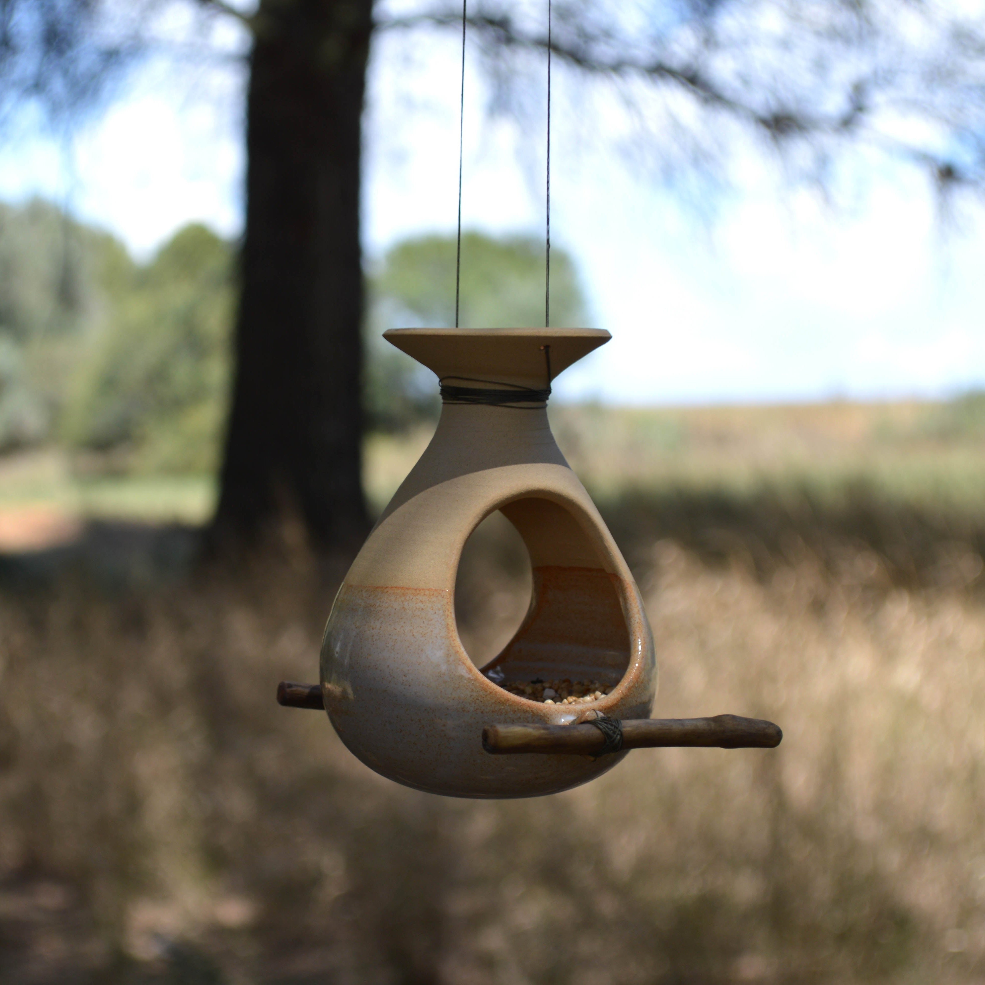Les menjadores per ocells estan fetes de gres d'alta temperatura. La part on es diposita el menjar en gra, està esmaltada per tal de mantenir-ho més higiènic, la resta té el color propi del fang al natural. Venen amb dues cordes de fil encerat, ja preparades per ser fàcilment penjades d'alguna branca o barana de balcó. La corda és resistent a l'aigua, igual que la fusta que també està tractada amb un oli especial per impermeabilitzar-la.La mida de l'obertura, està pensada per ocells petits, tipus mallerengues o pardals. De manera que coloms, tudons o d'altres ocells més grans no puguin accedir-hi. Mides: 8cm Ø (part mes ample), 12cm d’alçada i 5,5cm Ø cercle superior)