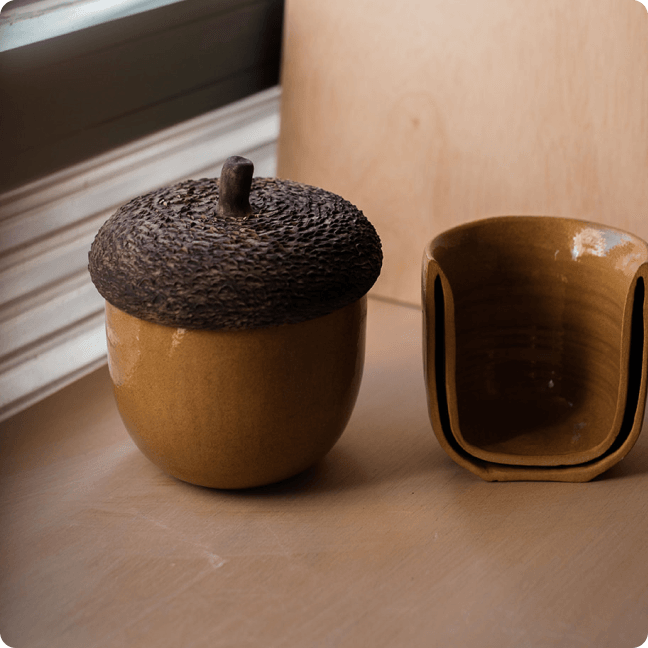 Les tasses aglà serveixen per infusionar i beure té. Estan fetes al torn, en tres peces separades i són probablement la peça més complexa que tinc en col·lecció. Són de gres, i com es pot veure a la primera imatge tenen doble paret. Aquest disseny està pensat per tal que no et cremis la mà en posar-hi l'aigua calenta i agafar-la. Es pot posar al microones i al rentaplats. No tenen una mida fixa, ja que m'agrada que siguin diferents com els aglans de debò. Mida i capacitat: Entre 9 cm - 10 cm Ø i 16 cm – 13 cm d’alçada amb la tapa. Entre 220ml i 280ml